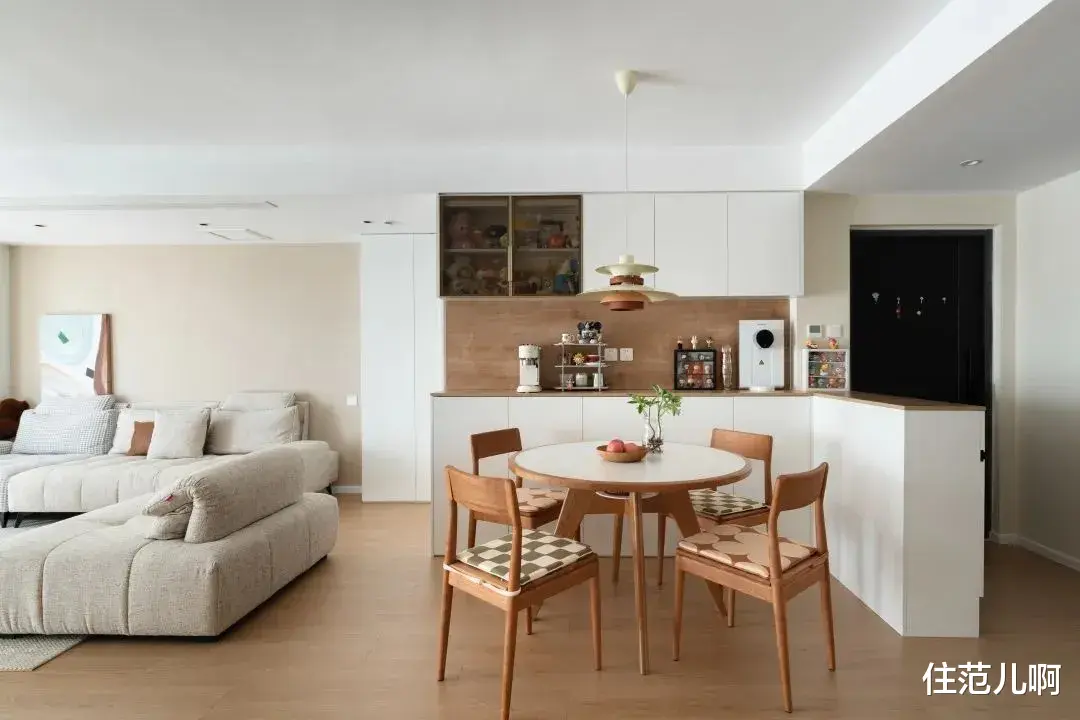 替换成直径 90cm 的圆桌,占地只有 0.6㎡,多出来的过道让狭小的餐区更有舒适感。