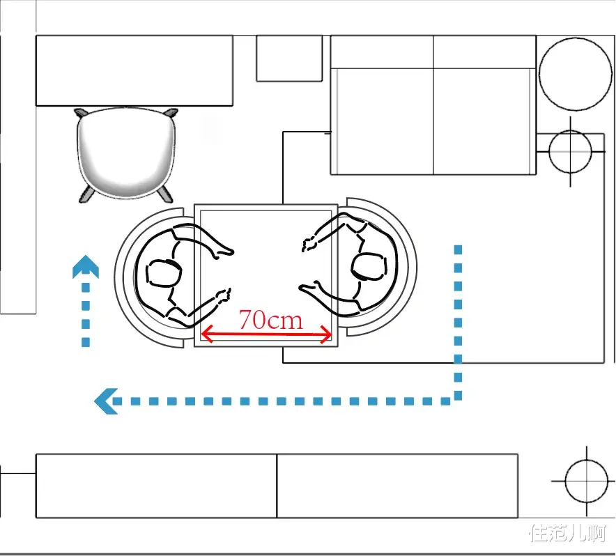 同样的餐桌面积,如果换成长桌,至少需要 70×120cm,这种情况下,两端只有 60cm 的通行空间,拐弯时未免显得局促。