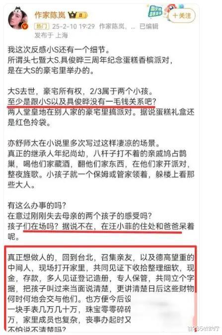 2月10日,陈岚在网上对小S发表不满言论,她对小S带领朋友前往大S豪宅里面开办第一场追思会的行为感到非常愤怒。