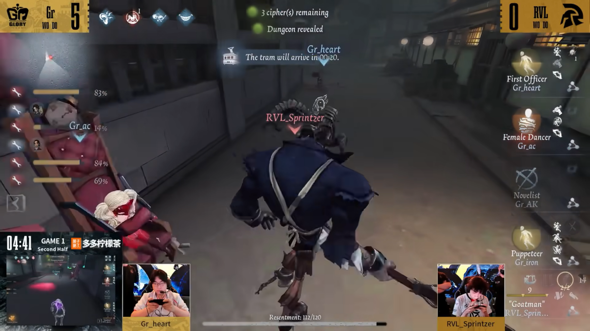 第二局上半轮RVL_Sprintzer的歌剧演员开局追击“囚徒”利用闪现将其击倒送椅。空军和佣兵轮流救下“囚徒”,“囚徒”牵制一段时间后被击倒淘汰。中期歌剧演员找到佣兵将其击倒,随后使用传送将空军击倒。紧接着求生者将密码机破译完毕。开门战中佣兵救下空军,歌剧演员将哭泣小丑击倒送椅,双方战平。下半轮比赛中Gr_Jin选择了时空之影,开局追击古董商将其击倒送椅。火灾调查员和佣兵轮流救下古董商,随后古董商被击倒淘汰。时空之影利用闪现将佣兵击倒,紧接着使用侵蚀传送击伤飞行家。随后时空之影先后击倒火灾调查员和飞行家并将火灾调查员送椅,佣兵扛伤救下火灾调查员后倒地。时空之影再次将飞行家击倒,随后闪现将火灾调查员击倒淘汰。最终时空之影找到佣兵将其击倒完成四抓。