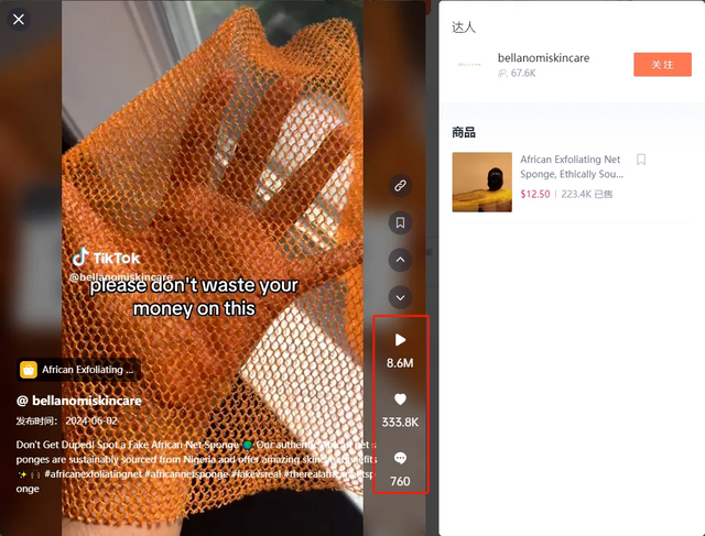 比如说,隶属于MeokyShop品牌旗下的一款隔热水杯,2023年8月份上线TikTok Shop,目前销量已经高达44万件,拿下了总共接近990万的销售额。再比如说,一款在国内批发价仅为4.8元人民币的去角质海绵网,在TikTok上的单条视频播放量高达八百多万,月售数万单,深受消费者欢迎。