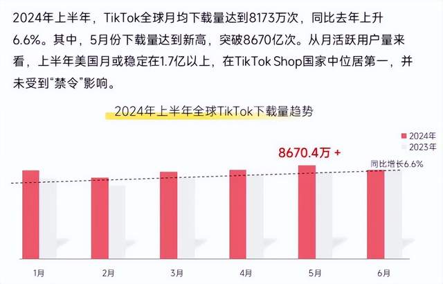 来自Shoplus超店有数发布的《2024年上半年TikTok电商数据报告》显示,2024年上半年,TikTok全球月均下载量高达8173万次,与去年同期比起来实现了6.6%的涨幅,五月份的下载量甚至达到峰值,超过8670亿次。此外,国际信息咨询公司Morning Consult的一项调查结果还指出,在美国,有64%的千禧一代和76%的Z世代用户活跃于TikTok Shop,成为该平台的购物主力军。