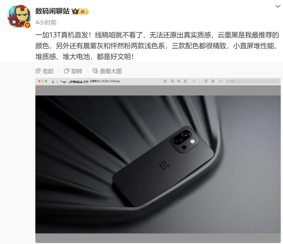 从博主“数码闲聊站”和“体验more”今日的消息了解到,新机拥有云墨黑、晨雾灰和怦然粉三种颜色,采用金属直角中框+玻璃后盖,重量仅185g。作为对比,iPhone 16 Pro手机重量为199g,想必重量更轻的一加13T单手握持感应该不会让人失望。