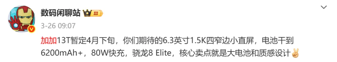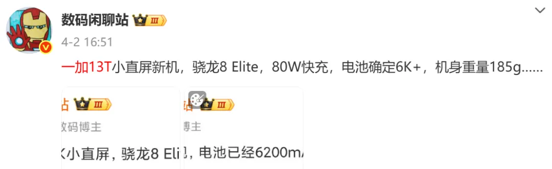 一加中国区总裁李杰透露,一加13T搭载6000+mAh冰川电池,而博主“数码闲聊站”则给出更激进的电池容量和充电功率信息,新机预计配备6200+mAh电池,支持80W有线快充,这应该是首款配备超过6000mAh电池的小屏手机,续航有望刷新小屏手机续航榜单!