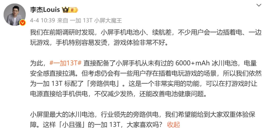 从6200+mAh大电池到骁龙8至尊版300万跑分,从6.3英寸小直屏到自定义快捷键,一加13T的野心肉眼可见:既要小屏手感,又要旗舰性能,还要续航灭霸!唯一的问题是——你的钱包答应了吗?毕竟,当一台手机能陪你肝游戏、能当充电宝反向续命、还能塞进牛仔裤口袋……或许,小屏党的春天真的来了。