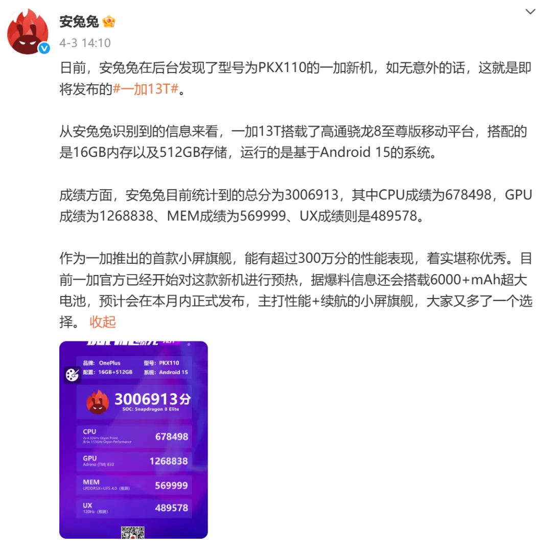 结合博主“数码闲聊站”消息和安兔兔官方公布的新机跑分数据,一加13T预计将搭载骁龙8 Elite(至尊版)处理器,LPDDR5X+UFS4.0存储组合,测试机型跑分超过300万,其中CPU成绩为678498,GPU成绩为1268838,MEM成绩为569999,UX成绩为489578,恐怖如斯!