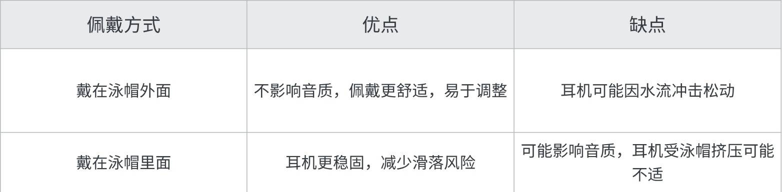 推荐:骨传导耳机适合戴在泳帽外,入耳式耳机适合戴在泳帽内固定,根据个人舒适度调整。
