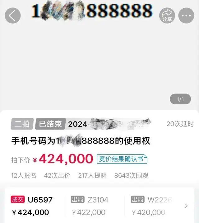 从商业价值看,靓号已形成完整产业链。2024年全国法院拍卖靓号成交额突破12亿元,相当于1.2万所乡村小学的年度经费。此前江苏盐城尾号"888888"的号码拍出42.4万元,深圳某"666666"号码甚至被炒到百万高价。