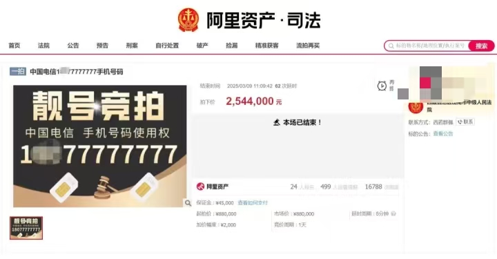3月9日,阿里资产拍卖平台上,1xx77777777和18x77777777两个号码引发24名竞买人激烈争夺。经过110轮竞价,前者以254.4万元成交,后者更是拍出285.2万元高价,总价超500万元。这两个号码分别属于中国电信和中国移动,归属地为南宁和钦州,起拍价均为88万元,相当于每"7"价值30万元。