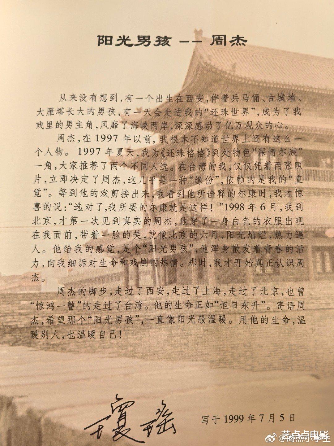 周杰在微博上回忆起自己与琼瑶的初次相遇,仿佛那段时光仍历历在目。他说:“我是万千个琼瑶小说读者中的一角,那时的我刚从一个懵懂少年拿着青春的站票,闯进了自己的车厢,而行囊里装着琼瑶帮我打开的情感世界。”琼瑶的小说,对于周杰来说,不仅仅是文字的堆砌,更是情感的启蒙,让他在青春的旅途中找到了心灵的慰藉。