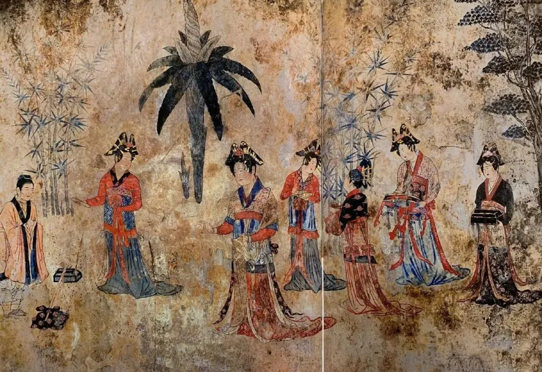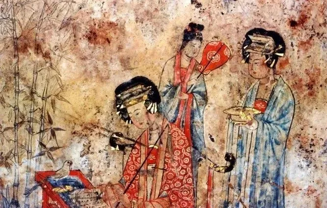 不过,这位契丹贵族墓中的杨贵妃,显然已被异化,例如,这幅壁画的画面颜色和晚唐的淡雅风格十分不符合,非常的旖旎、华丽、鲜艳。贵妃留着典型的辽代贵族女子发型,戴上了契丹风格突出的头饰,而服侍在贵妃身侧的仕女,也佩戴了契丹妇女喜爱的头饰,凸显了草原风格。