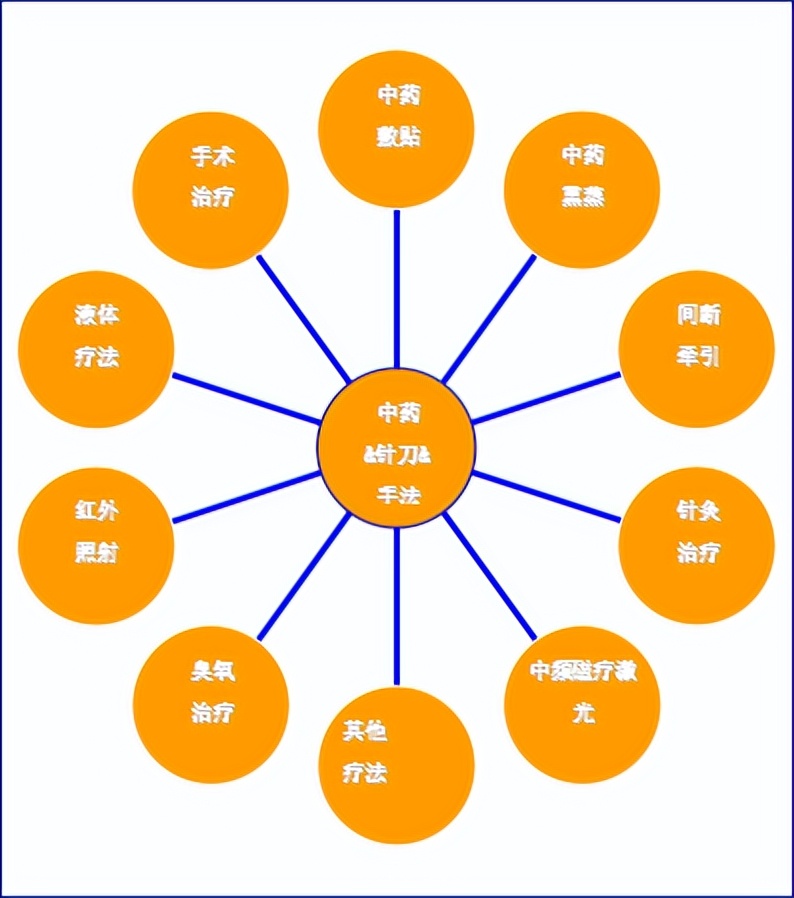 “X”表示其它可以选用的疗法 如:中药敷贴、中药熏蒸、间断牵引、针灸治疗、中频脉冲、电磁治疗、激光治疗、红外照射、液体疗法、臭氧治疗、手术治疗(微创手术、减压手术、置换手术、牙基质术……)等。这些疗法中大部分是保守疗法,也称绿色疗法,主要作用的共同点:止痛;消除肿胀;改善血液循环,促进炎症消散;缓解肌肉痉挛、肢体麻木、关节僵硬。而液体疗法可以改善全身血液循环状况,臭氧治疗可以快速有效的消除局部炎症,手术治疗主要用于保守治疗疗效差的严重晚期股骨头坏死患者。