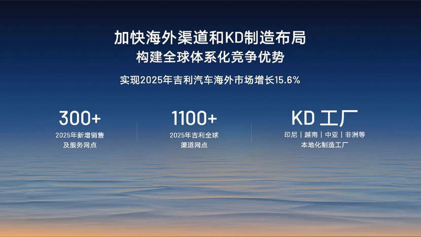 在海外渠道建设方面,吉利今年将增加300多个销售及服务网点,预计到年底全球渠道网点将超越1100家,进一步提升吉利的渠道覆盖和售后保障能力。同时,吉利也加速推进KD制造布局,在印尼、越南、中亚、非洲等多个国家推进KD本地化制造,有效提高全链成本竞争力。