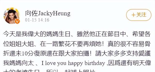 没想到郭碧婷和向太的生日仅仅只差了一天,向佐在1月16日发文祝伟大的妈妈生日快乐,希望《一路繁花》节目组的成员不要烦妈妈,真的是非常实诚的好儿子了,1月17日就晒出了一家人过生日的照片了。