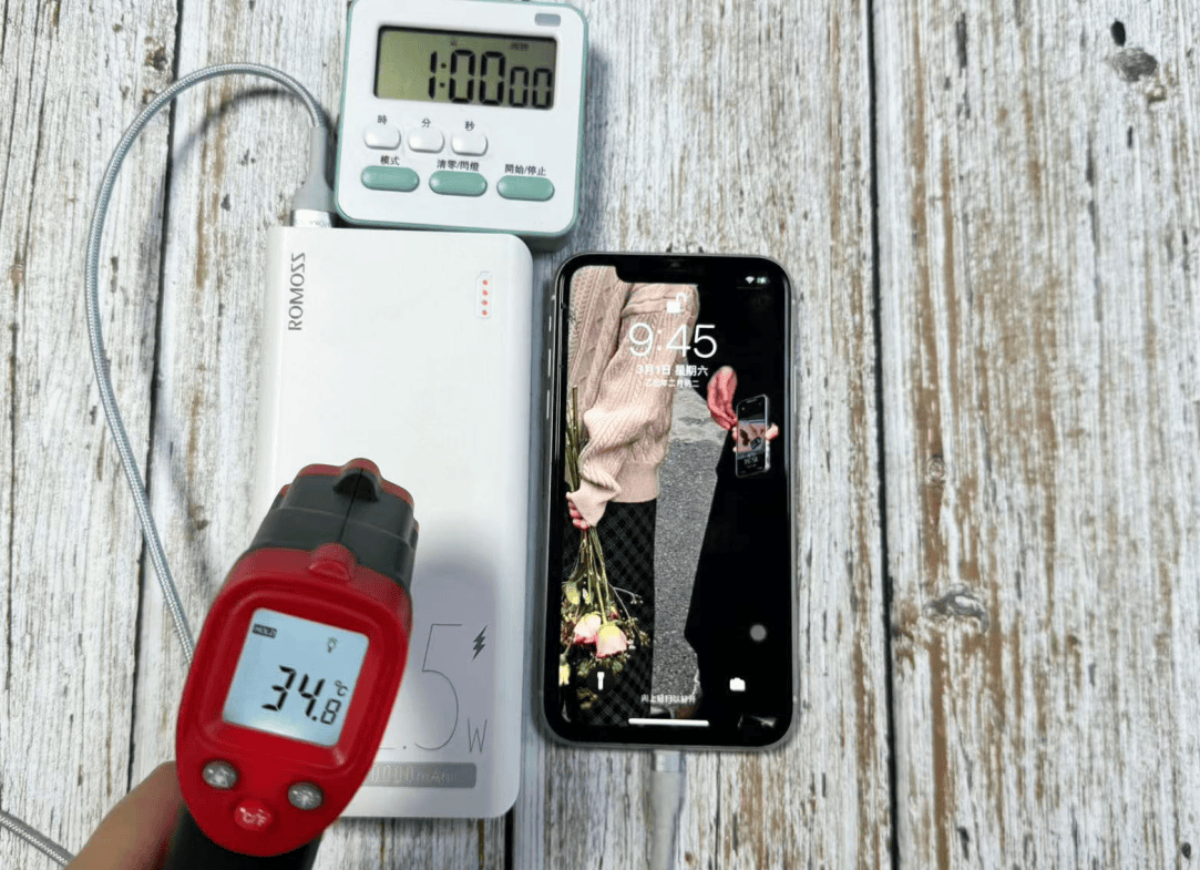 罗马仕这款充电宝在控温技术方面是配备了智能控温芯片+NTC温控,因此在散热方面的话还算可以,温度仅达到了34.8℃。