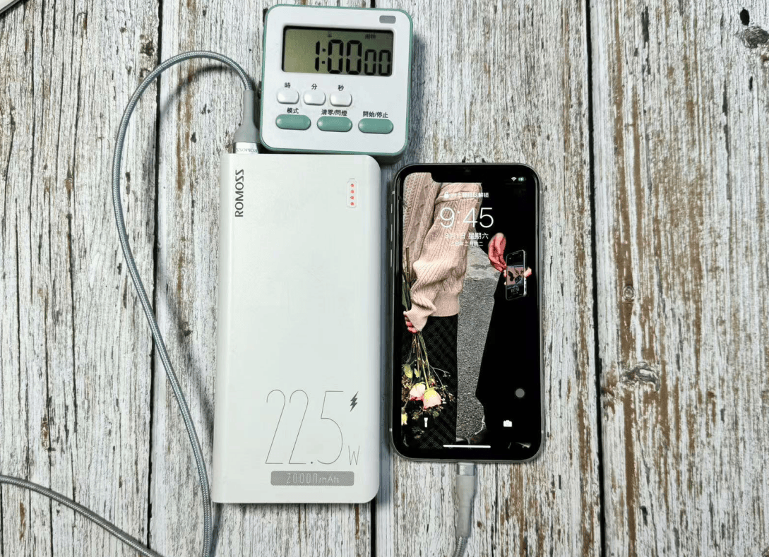 罗马仕的这款充电宝充电时需要用户自行准备数据线,其具备最高 20W 的充电功率。充电测试数据显示,30 分钟可将电量仅 1%的手机充至 39%,充电 60 分钟时,手机电量能达到 82%。