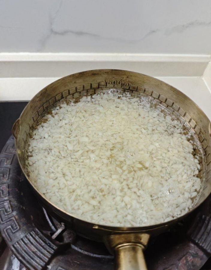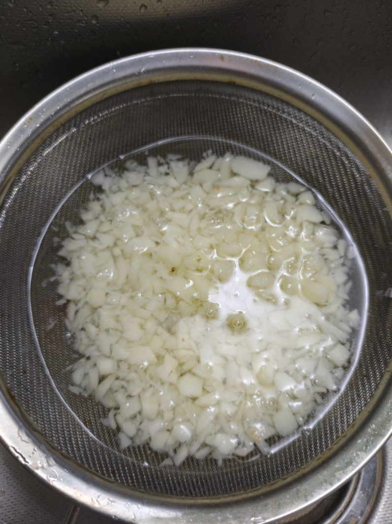 3. 奶锅水烧开后,倒入马蹄粒烫一两分钟