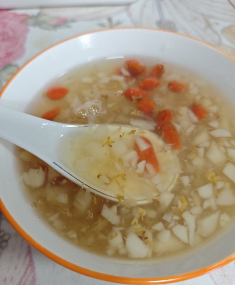 7. 最后放上几颗枸杞,一碗又脆又爽的马蹄爽出锅了!