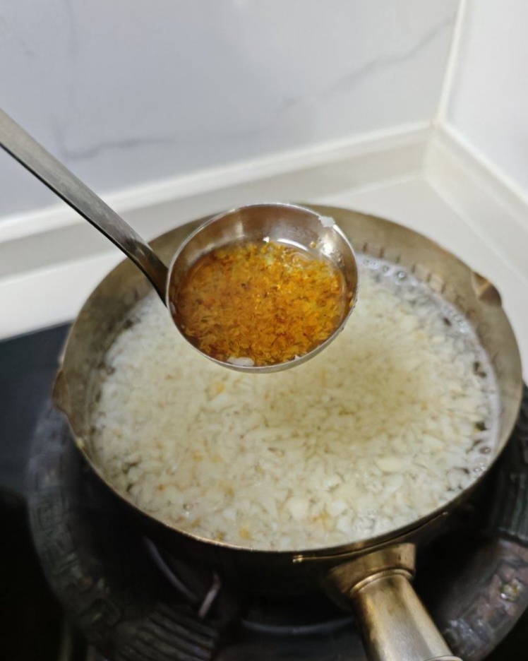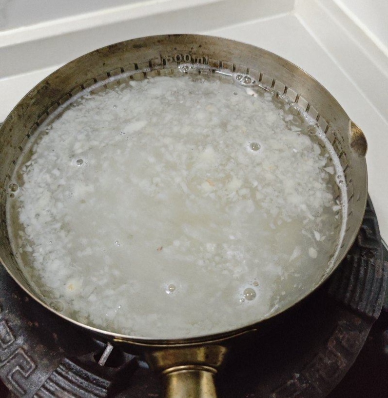 5. 在另烧一奶锅水,再次倒入马蹄粒与黄糖片,如无黄糖片,就加黄冰糖。