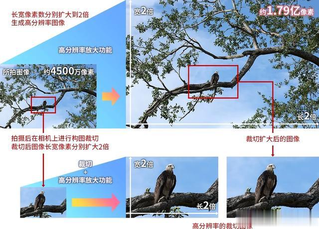 经过相机内高分辨率放大处理后,可生成分辨率为原始分辨率4倍的图像,即从约4,500万像素提升至约1.79亿像素(机内高分辨率裁切后放大图像,并非摇摇乐),放大显示时也可维持之前的精细感。
