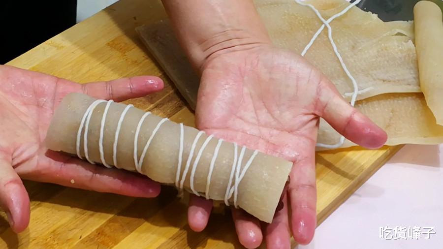 3.然后取一张猪皮,中间放上腌制入味的里脊肉条,从一边慢慢地卷起来,尽量卷得紧实一点,防止散花,然后再用绳子将其缠绕着捆起来。另一个也这样捆好,如果还有剩下的猪皮,可以不加肉,直接卷成猪皮卷,做好后味道也是相当不错的。