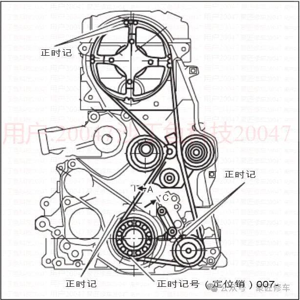 在曲轴齿带轮B及平衡轴齿带轮上安装正时齿带B,张紧一侧不允许有松弛。