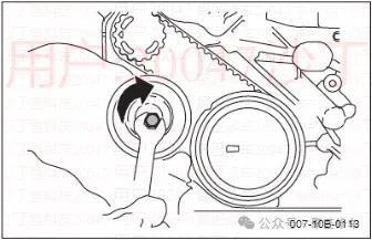 在用手指对着正时齿带张紧器一侧施加力的同时向箭头方向移动张紧器B。此时拧紧螺栓使张紧器 B固定。