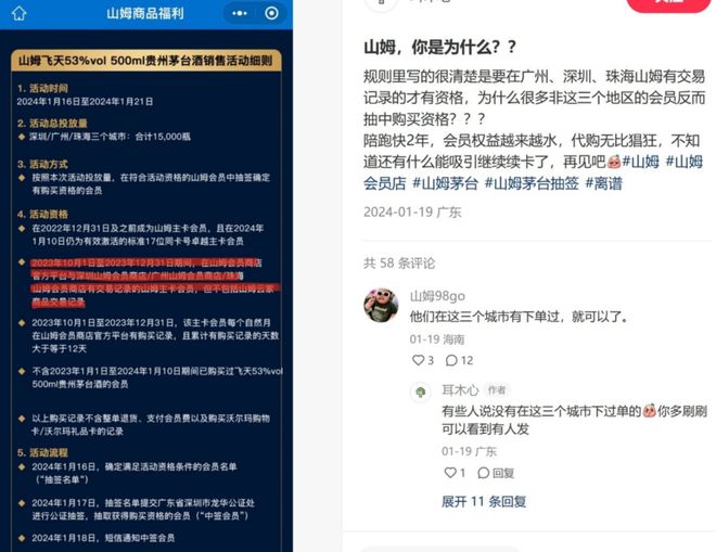 要参加这个活动,门槛可不低。你得是山姆的卓越主卡会员,年费680元。虽然有些会员觉得这钱花得值,但更多人觉得这条件太苛刻了。毕竟,不是每个人都能轻松掏出680元的年费,更别说还要满足其他消费要求。有会员在社交平台上吐槽,说过去一年还能有两次平价购买茅台的机会,现在却要通过抽签,条件越来越严。