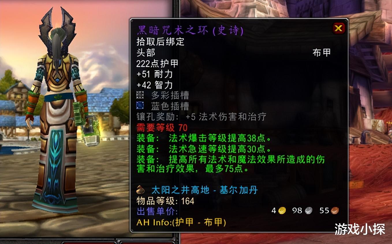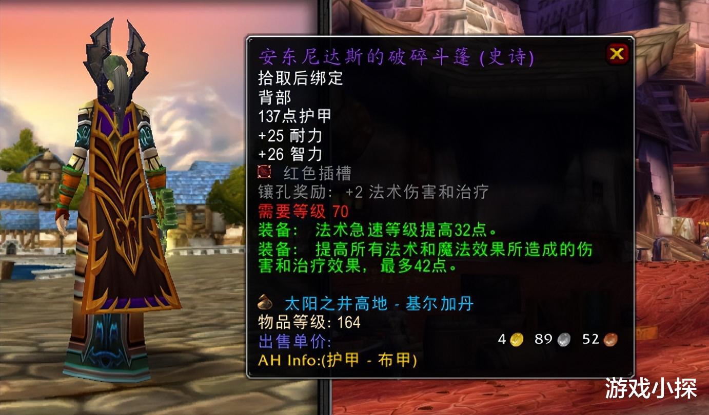 不愧是达拉然首席大法师安东尼达斯的装备,这件披风的属性堪称离谱,本身就有高达42点法伤,还有1个红色插孔可以插12点法伤,插槽奖励还是2点法伤,一共就是56点法伤,一件披风就给56法伤和32急速,比T6级别的大件装备还要强,小探都要不相信自己的眼睛了。安东尼达斯的破碎斗篷由基尔加丹掉落,是TBC少有的可以一直用到开荒诺森德NAXX的大极品装备。
