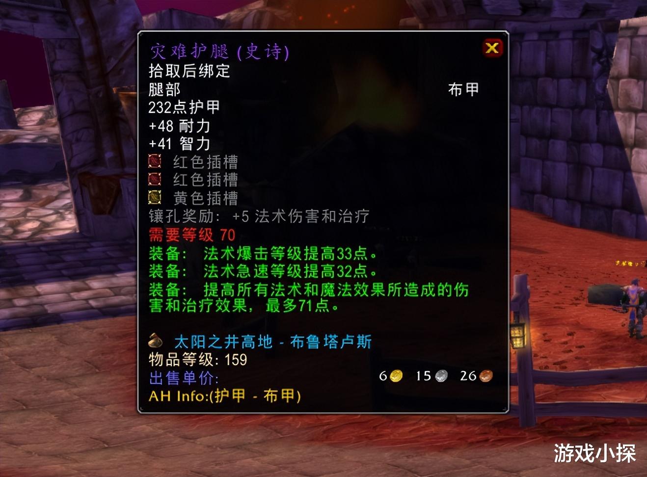 PS:灾难护腿和萨满T5腿重名,他们的英文名称也非常有趣,萨满T5腿叫“Cataclysm Leggings”,直译为“大灾变护腿”,太阳井的布甲腿叫“Leggings of Cataclysm”,直译为“与大灾变有关的护腿”,这两个词组到底有什么细微的差别,英语好的玩家可以帮忙解释一下。