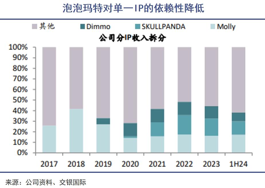 作为泡泡玛特的旗舰IP,Molly的销售占比在IPO初期占据了较大份额,但随着时间推移,泡泡玛特不断推出新的IP,分散了消费者的注意力,Molly的销售占比从巅峰时期的89%下降到了2024H1的17.2%。