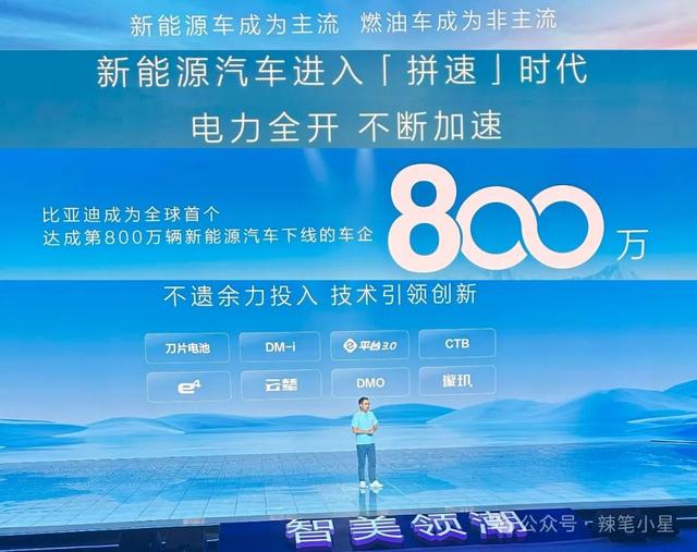 新能源汽车的崛起不仅是市场选择的结果,更是技术进步的体现。以比亚迪为例,其在技术上的不断突破和创新,极大地提升了新能源汽车的性能和用户体验。根据发布会最新信息比亚迪已经成为全球首个达成第800万辆新能源汽车下线的车企。这一成就展示了比亚迪在新能源领域的领先地位和技术实力。