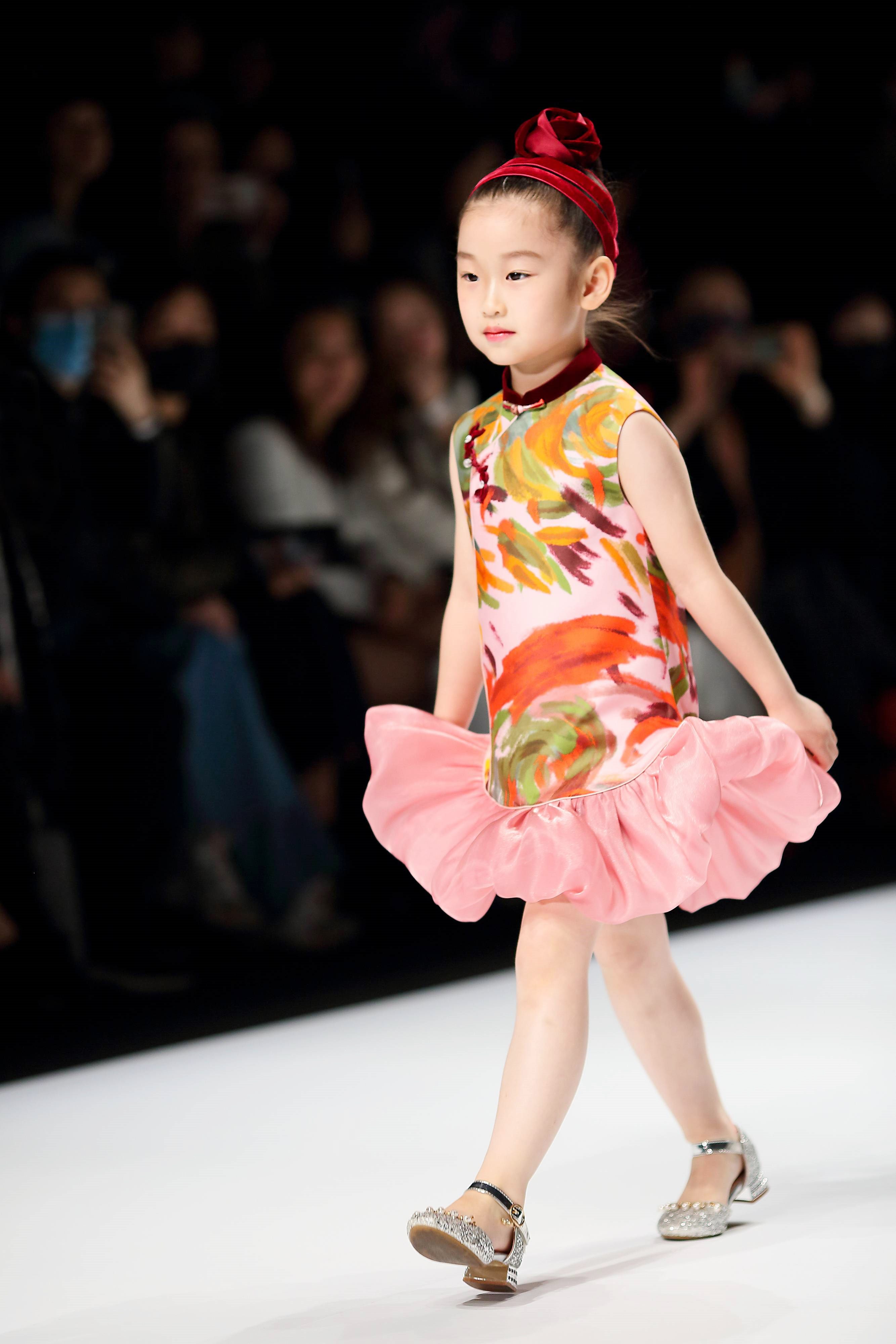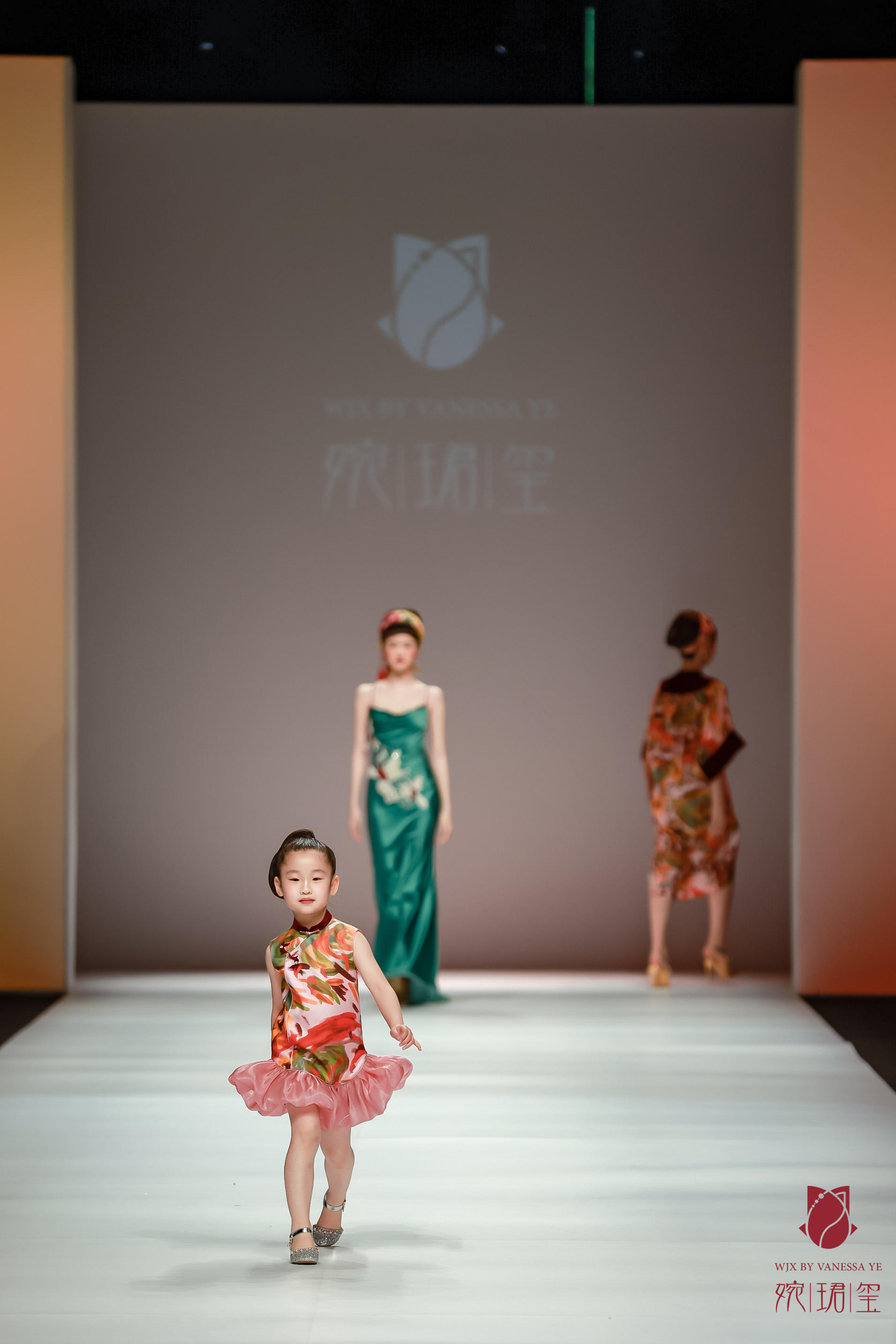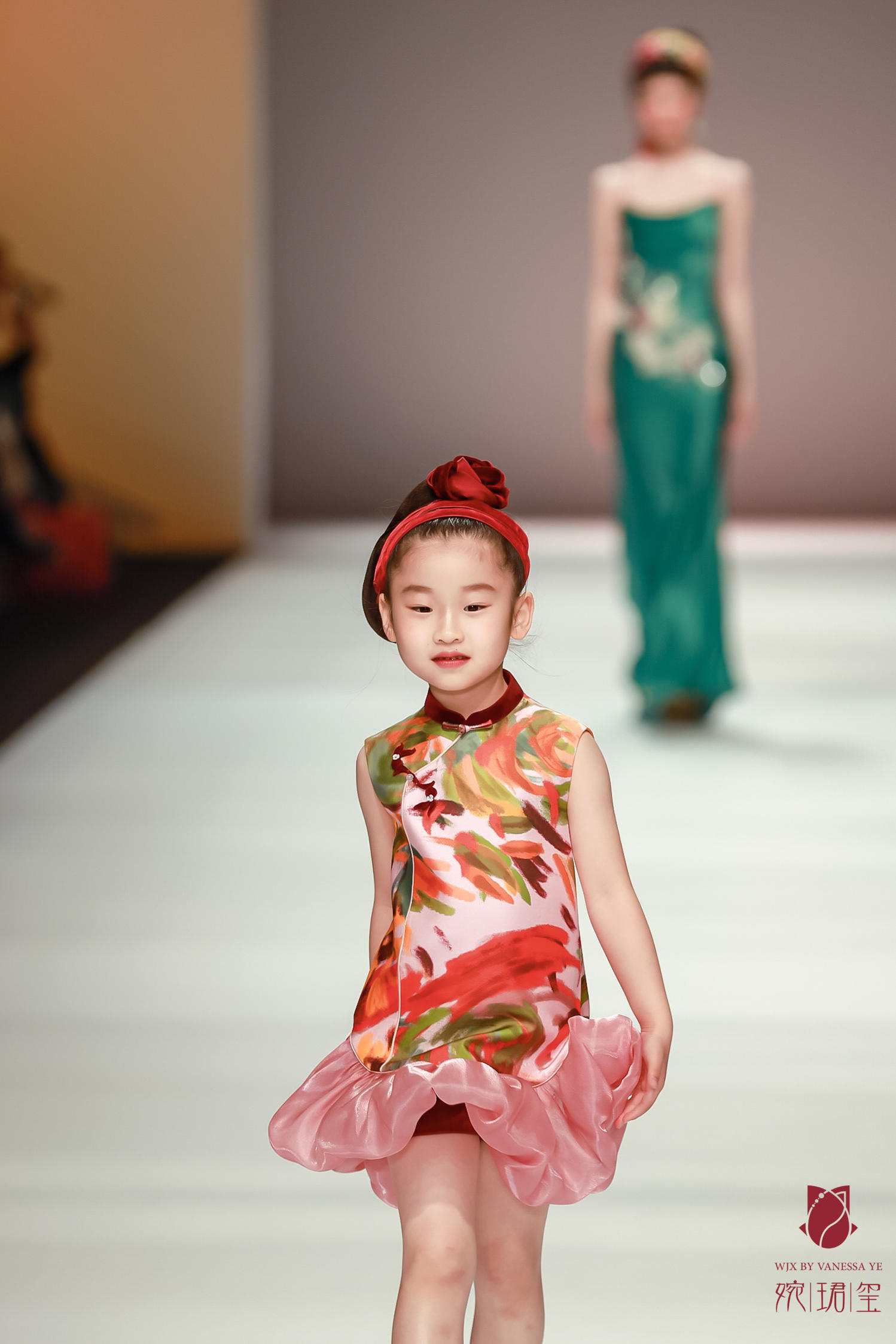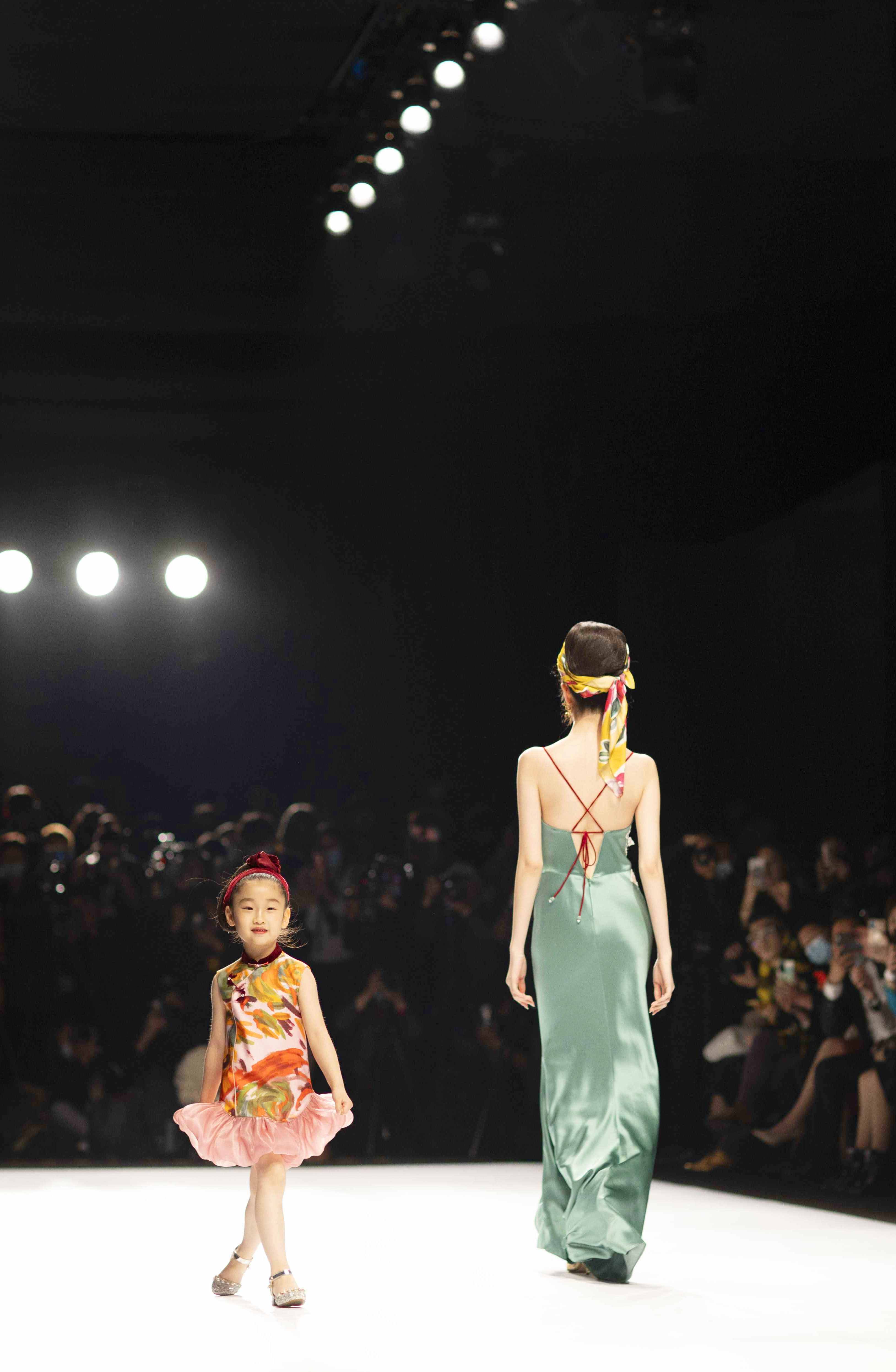 大秀上,老上海复古摩登的音乐与街头弄巷的声音交织,黄福熙(小蛋面儿)身着一件新中式蓬松边裙旗袍礼服亮相,观者也即刻代入其中、进行了一次和历史穿越时空的对话。黄福熙(小蛋面儿)就像一个从百年前老上海的历史长河中走过来的小女孩,步履轻盈、端庄大方,精美绝伦的华服加上精心打造的妆容,就像镜中人,而我们之于她,又何尝不是镜中人?黄福熙(小蛋面儿)本次大秀意在表达遇见自己、童年与未来的呼应,也在传递美好、和谐、圆满的理念。可爱至极的亚洲最小超模加上与其他模特相呼应的华服、配饰,令观者忽而惊喜于黄福熙(小蛋面儿)可掬的神情、忽而惊叹于极致美好的服饰,沉浸在其乐融融、“月圆花好”的精彩时分,意犹未尽。