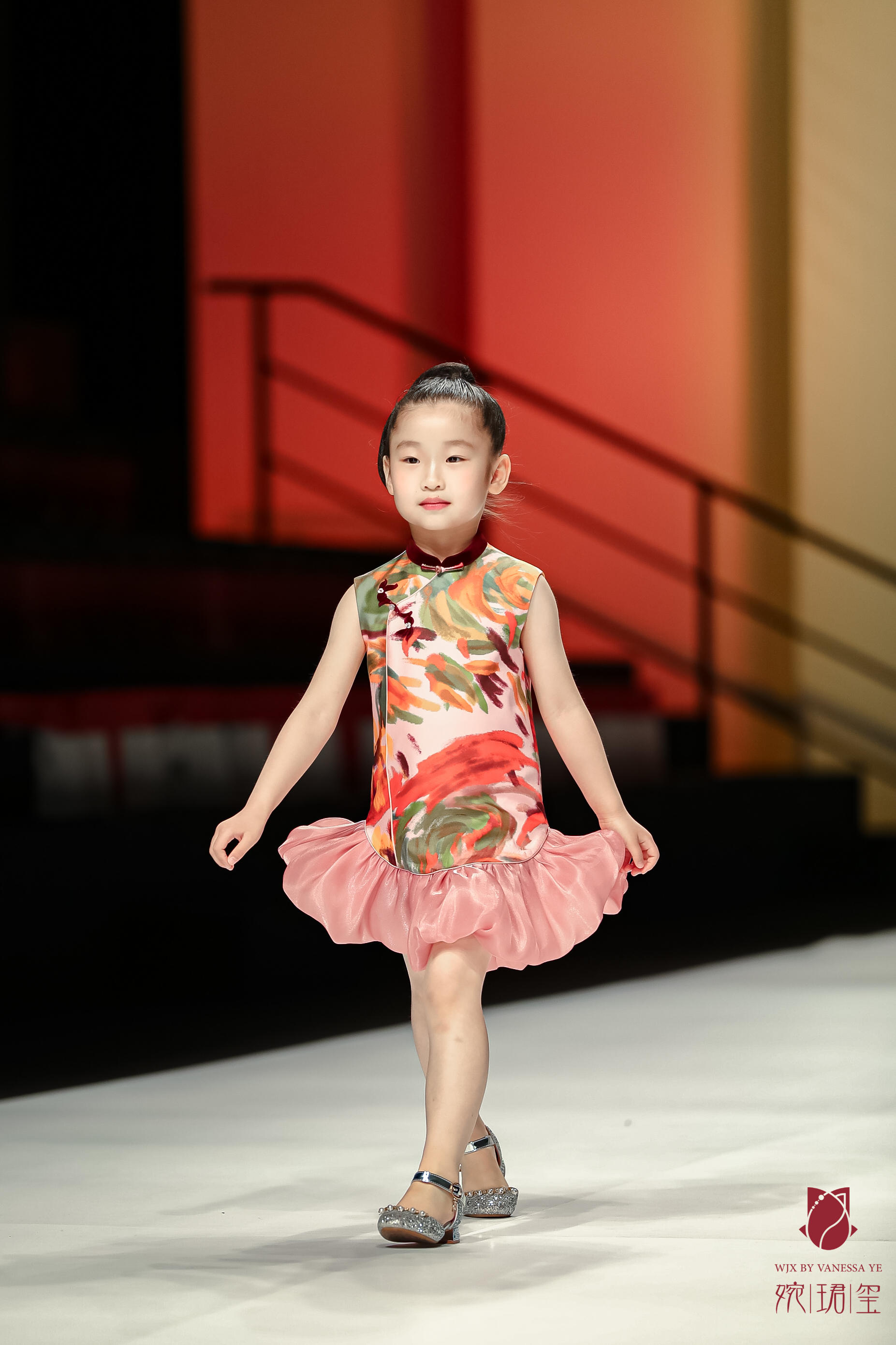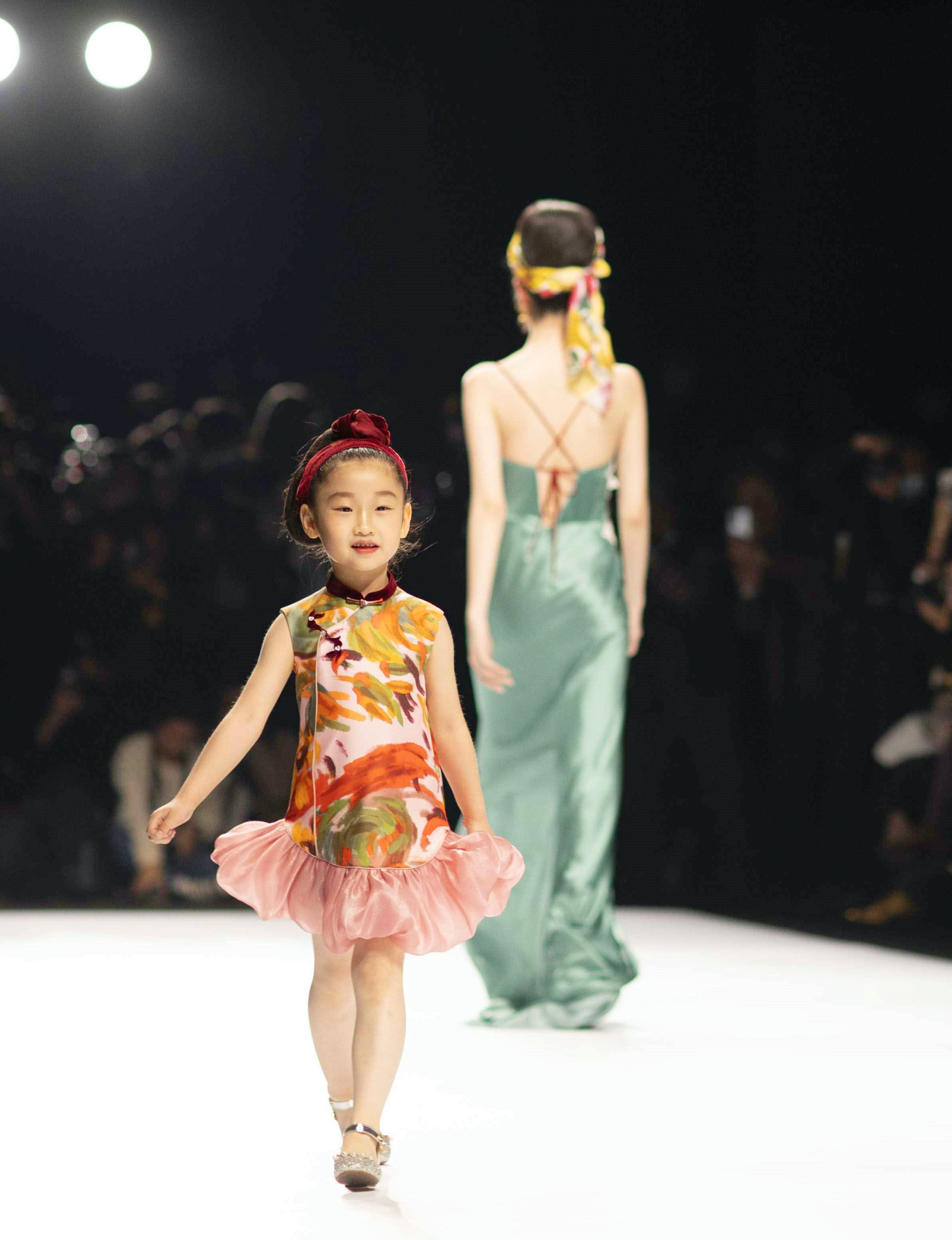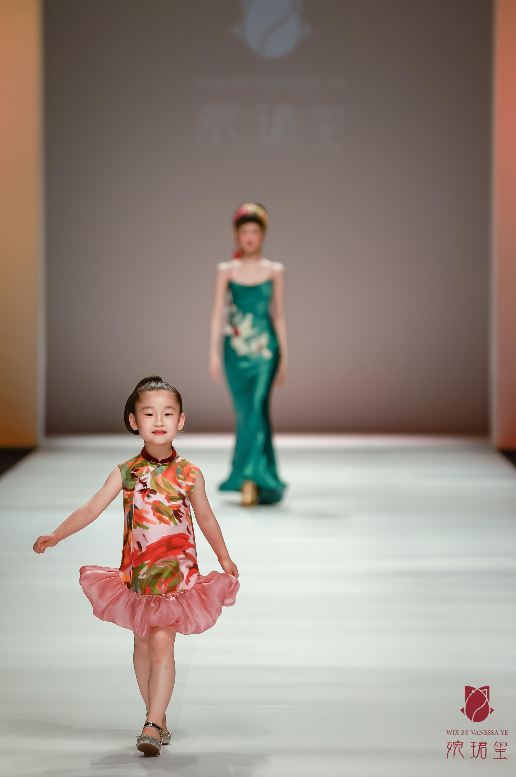 大秀上,老上海复古摩登的音乐与街头弄巷的声音交织,黄福熙(小蛋面儿)身着一件新中式蓬松边裙旗袍礼服亮相,观者也即刻代入其中、进行了一次和历史穿越时空的对话。黄福熙(小蛋面儿)就像一个从百年前老上海的历史长河中走过来的小女孩,步履轻盈、端庄大方,精美绝伦的华服加上精心打造的妆容,就像镜中人,而我们之于她,又何尝不是镜中人?黄福熙(小蛋面儿)本次大秀意在表达遇见自己、童年与未来的呼应,也在传递美好、和谐、圆满的理念。可爱至极的亚洲最小超模加上与其他模特相呼应的华服、配饰,令观者忽而惊喜于黄福熙(小蛋面儿)可掬的神情、忽而惊叹于极致美好的服饰,沉浸在其乐融融、“月圆花好”的精彩时分,意犹未尽。