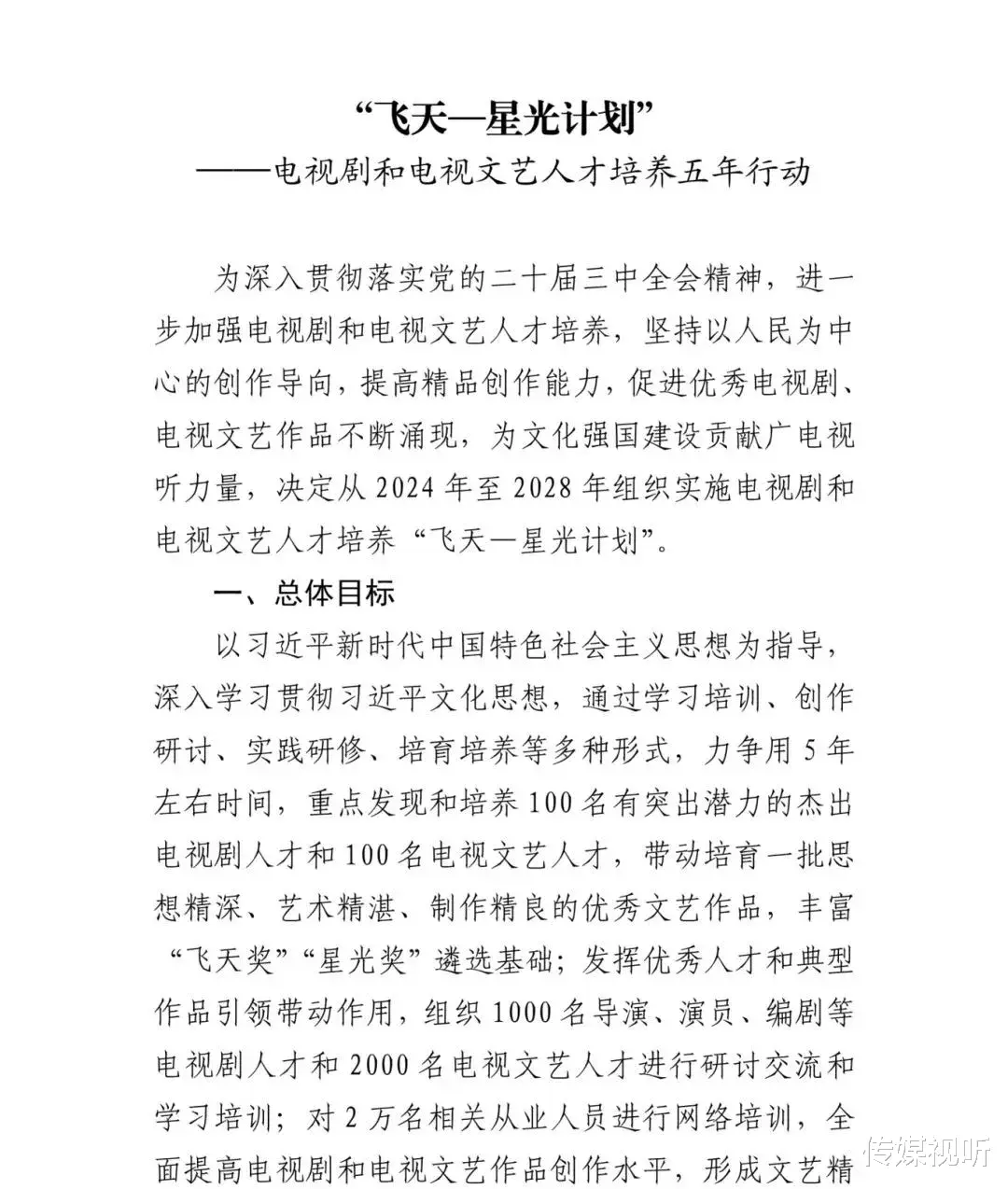 为深入贯彻落实党的二十届三中全会精神,进一步加强电视剧和电视文艺人才培养,提高精品创作能力,促进优秀电视剧、电视文艺作品不断涌现,广电总局启动实施《“飞天—星光计划”——电视剧和电视文艺人才培养五年行动》。