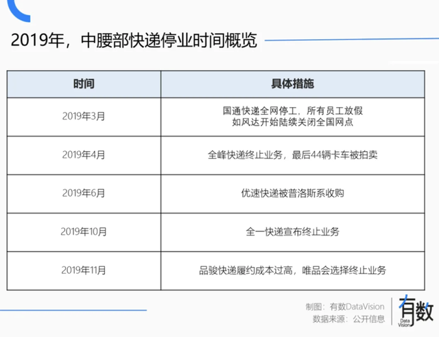 2019年前后,快递业结束了年均50%的高增长,通达系纷纷跨过日均2000万单的阈值,凡客的如风达、唯品会的品骏快递、以及国通、全峰、优速等中腰部快递纷纷退场,行业出现整合出清迹象。