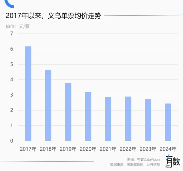 另一个例子是单票价格。顺丰的单票均价高达14.35元,作为对比,电商宇宙中心义乌的单票均价已经跌到2.44元,约为前者的1/6。