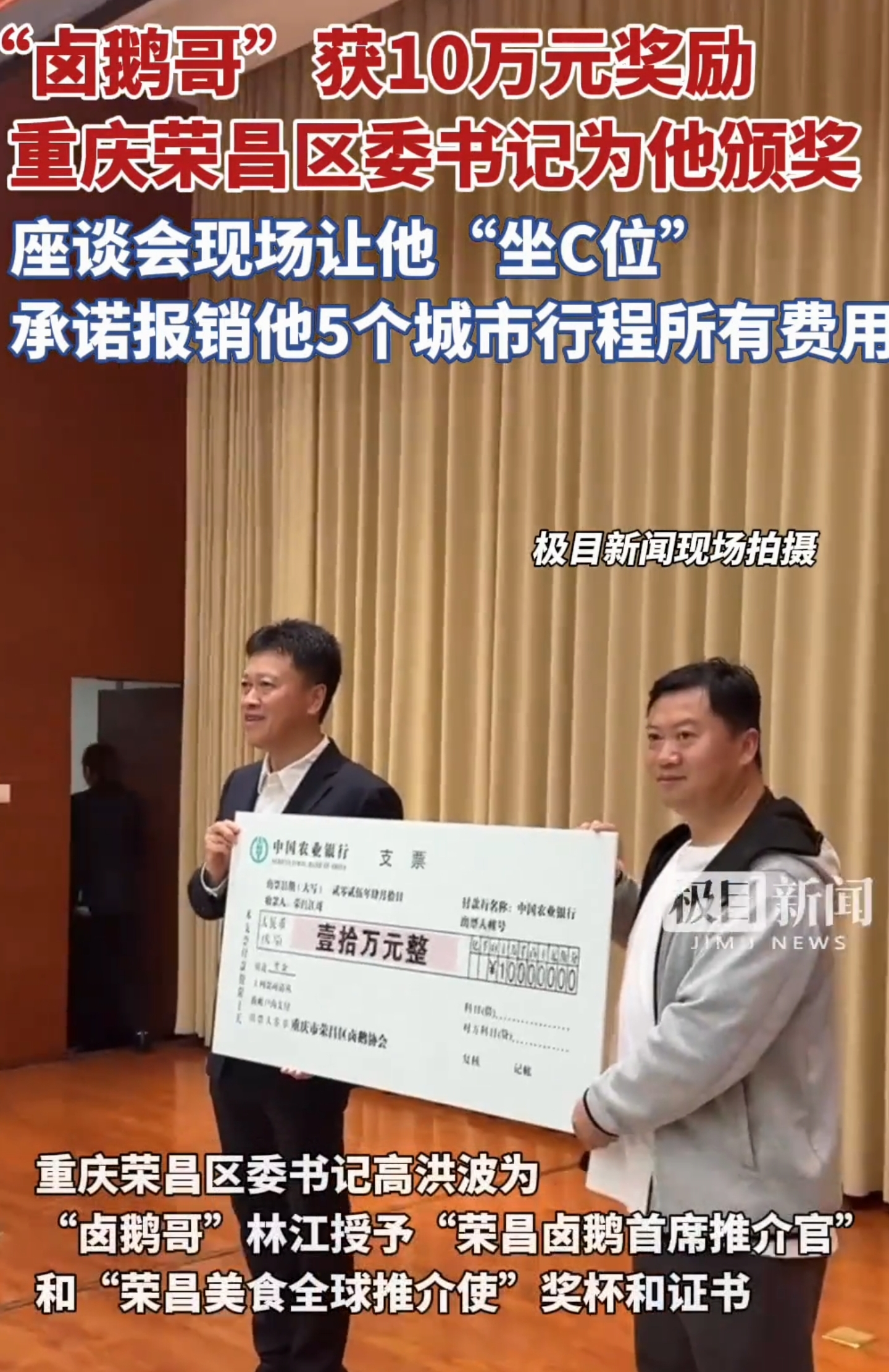 更魔幻的是,荣昌区政府竟然直接给林江封了两个头衔——“卤鹅首席推介官”和“美食全球大使”,不仅报销了他五城追星的费用,还奖励了10万元的现金!此消息一出,当地的卤鹅企业集体沸腾,直接在高铁站拉横幅迎接“英雄”,当地企业的线上订单也是直接翻倍,甚至有店家卖到断货。
