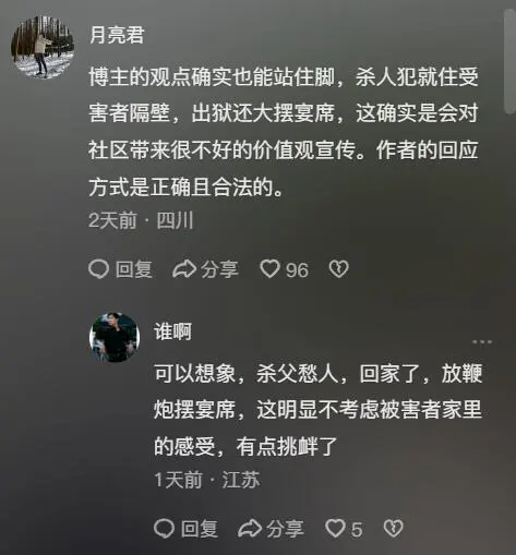 本来是一件家丑,杀了人,出狱了还这么张扬,这样的风气,是问,作为受害人的邻居家属,看到了心里能不难过吗?