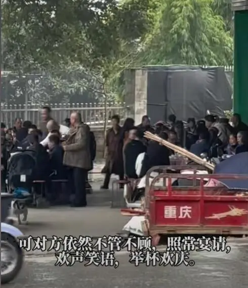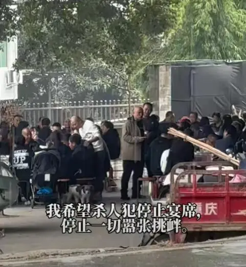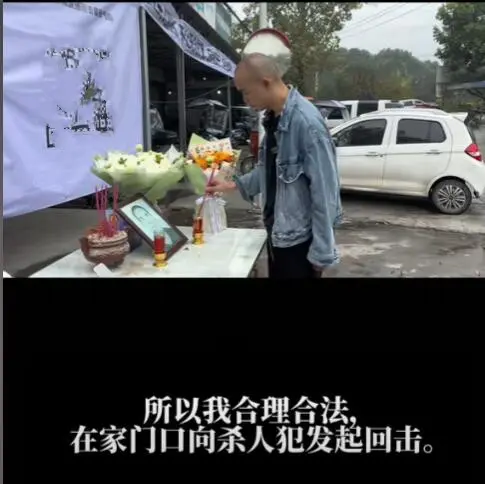 看到杀父仇人大摆酒席庆祝,死者家属,丧父的伤痛,再次席卷而来,对于杀父仇人大摆酒席的挑衅行为,当事人当即就在自家门口,摆起了一个对父亲的追思会,表达抗议。