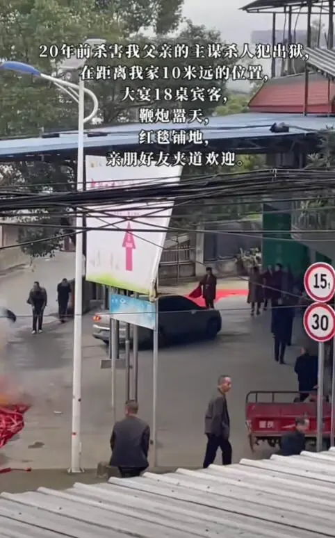 11月19日,四川一位男子在网上声诉,20年前,自己的父亲,被邻居雇凶杀害,如今,凶手刑满释放出狱,结果,对方直接当着他们家人的面,大摆酒席118桌,邀请宾客180人,走红毯,鞭炮齐鸣,向他家人发来挑衅。
