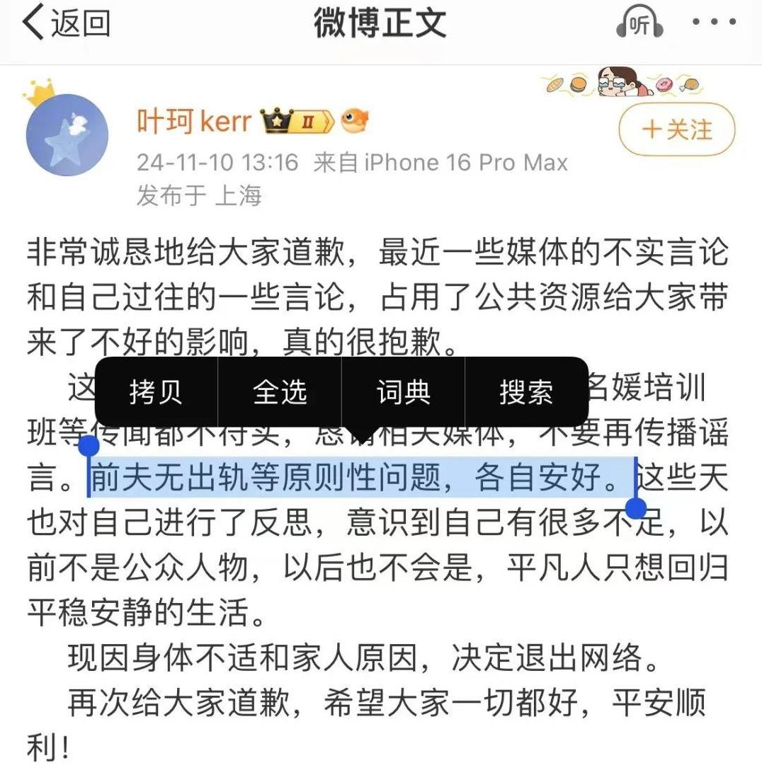 是不是感觉很奇怪?和现任的问题,怎么就扯到了都离婚了几年的前夫哥身上?这次官宣退网,也或多或少有点为了堵前夫哥嘴的意思。大概前夫哥手上的料,可以回了叶珂,也能毁掉黄晓明。
