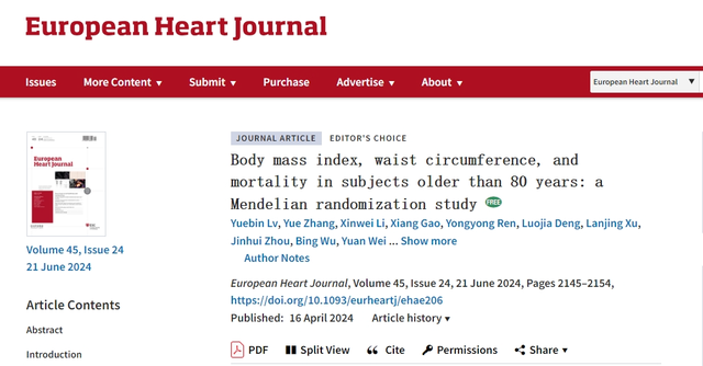 2024年4月,中国疾病预防控制中心施小明/吕跃斌研究团队发表在《欧洲心脏杂志》上的研究指出,老年人体重微胖或更长寿。