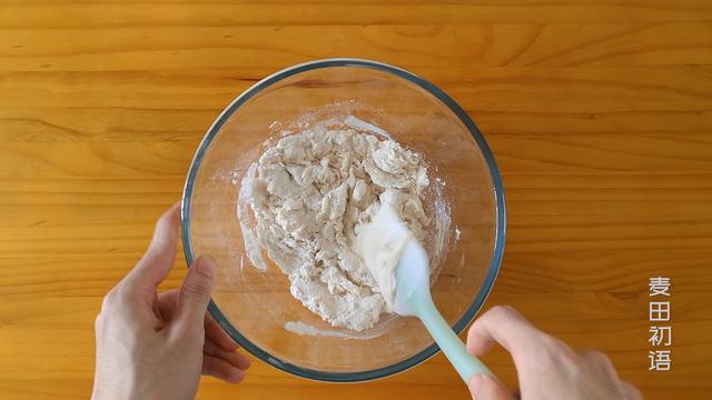 将80克水和全蛋液混合均匀,再加入和面盆中,用刮刀搅拌成面块。
