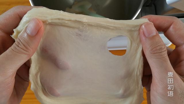 取一小块面团一边旋转一边抻开,能拉出较粗的膜,说明面筋已经初步形成,大概在6成左右。