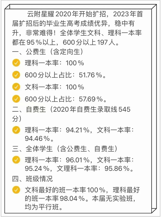 其中,2023年云大附中星耀学校扩招后的首届高考,全体学生文科、理科一本率都在95%以上,600分以上197人。其中,公费生(含定向生)文科、理科一本率均为100%,600分以上占比均超过50%。
