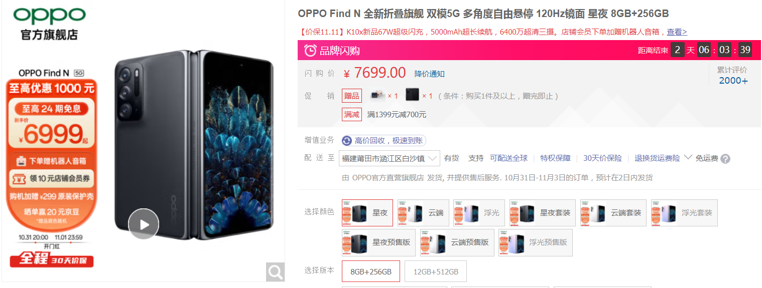 在双十一期间,OPPO Find N可享至高优惠1000元、24期免息、10元店铺会员券和礼品赠送等多重叠加优惠,实际到手仅为7699元起,喜欢大屏体验的朋友可以冲。