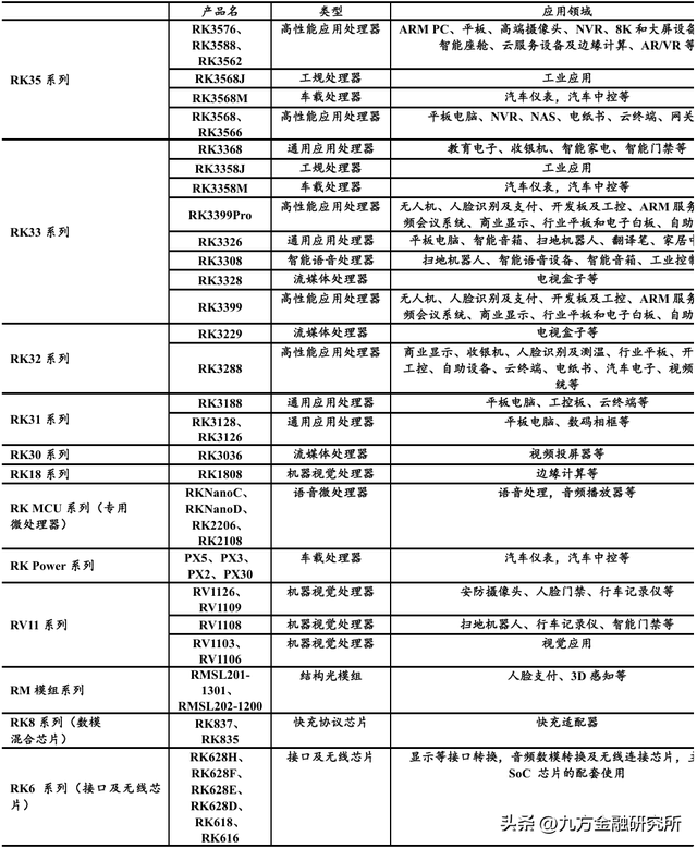 瑞芯微是国产人工智能物联网(AIoT)芯片领域的龙头企业之一。公司是我国最早一批探索机器视觉领域的企业,目前在语音识别、图像识别等领域已经成为技术领先者。其主要产品SoC芯片广泛应用于智能工业应用、智能车载应用、智能安防等多个应用环境中。