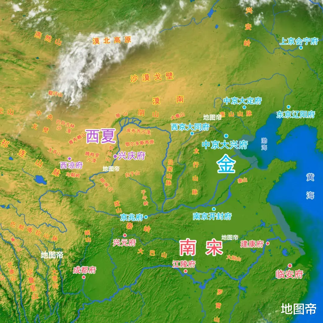 金朝鼎盛时期,北部继承了辽朝国土,南部与南宋以秦岭淮河为界,并且取得了关中、河西、河北、河南大片地盘。夏、商、周、秦、汉、唐的国都所在,都在金朝疆域内。