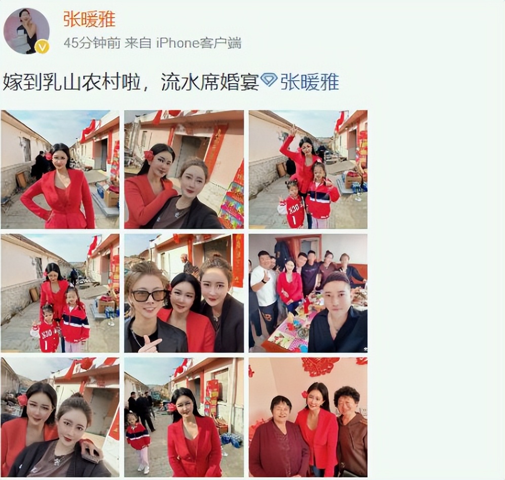 张暖雅晒出的婚礼照片,乍一看还以为是哪个农村的亲戚结婚。门口挂着大红花,旁边堆满了烟花,估计晚上要点亮半个村子。